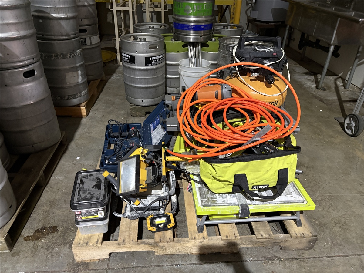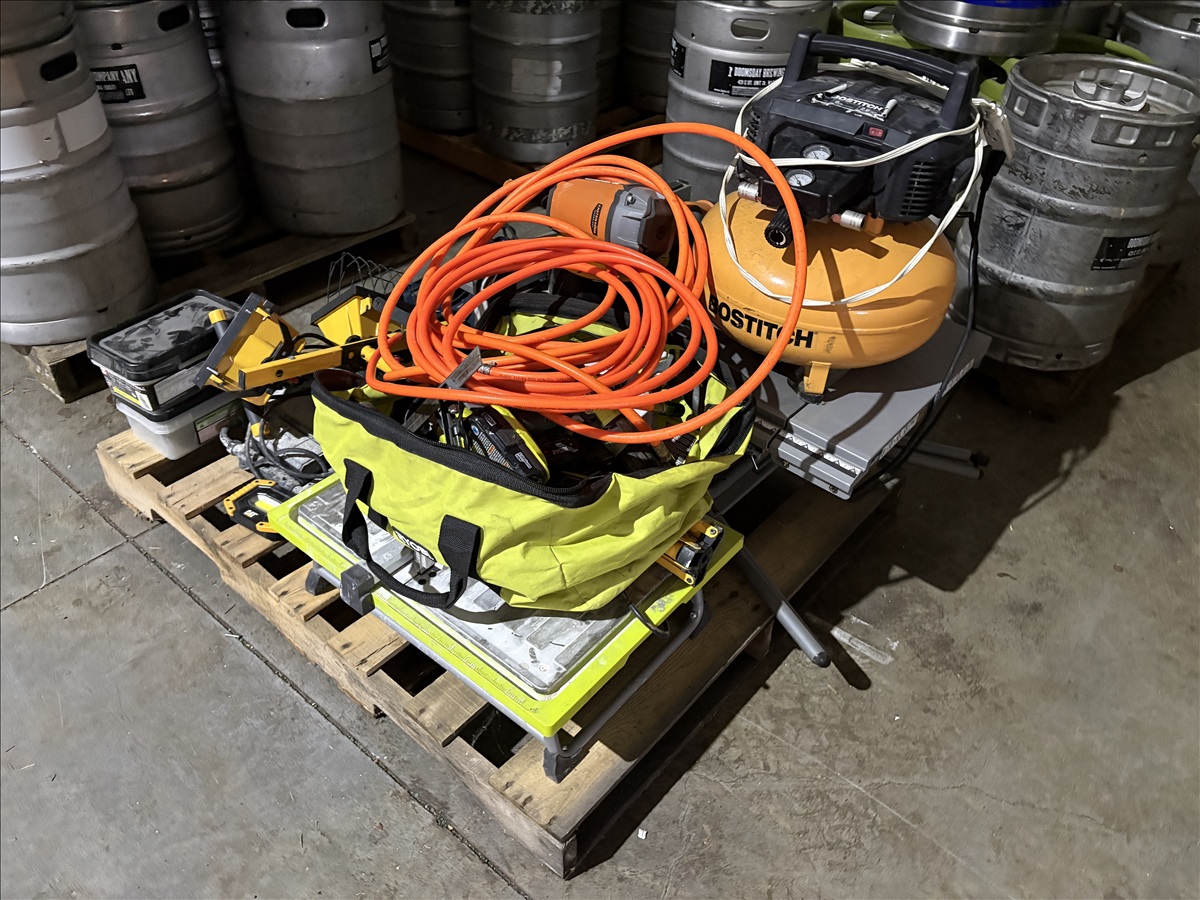 ASSORTED TOOLS TO INCLUDED: BOSTITCH 6-GAL. PORTABLE PANCAKE AIR COMPRESSOR, TILE SAW, COUNTER-TOP TABLE SAW, RYOBI CORDLESS HAND TOOLS, ROTOHAMMER