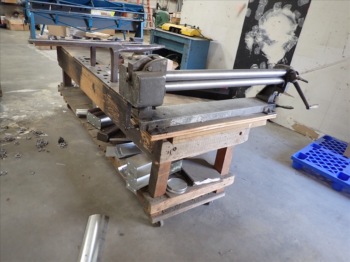 BENCH W/36" MANUAL ROLLS, (2) ANVILS, VISE & MISC.
