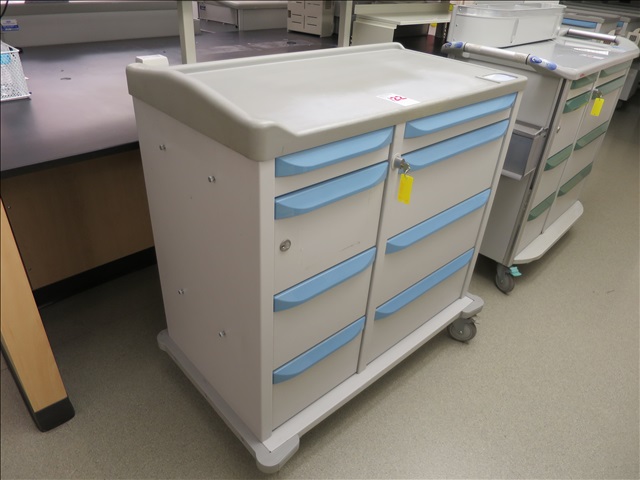 42" 8-DRAWER MEDICAL CRASH CART ON CASTERS W/(2) LOCKS (MISSING 1 KEY, BLUE)