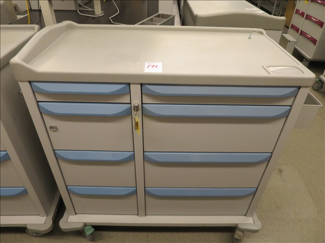 42" 8-DRAWER MEDICAL CRASH CART ON CASTERS W/(2) LOCKS & KEYS (BLUE, CRACKED TOP CORNER)