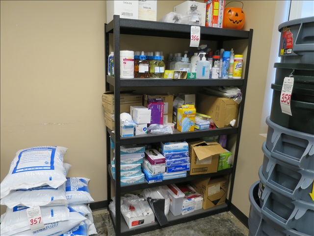 LOT, MISC CLEANING SUPPLIES & 4' METAL SHELVING (CUSTODIAL AREA)