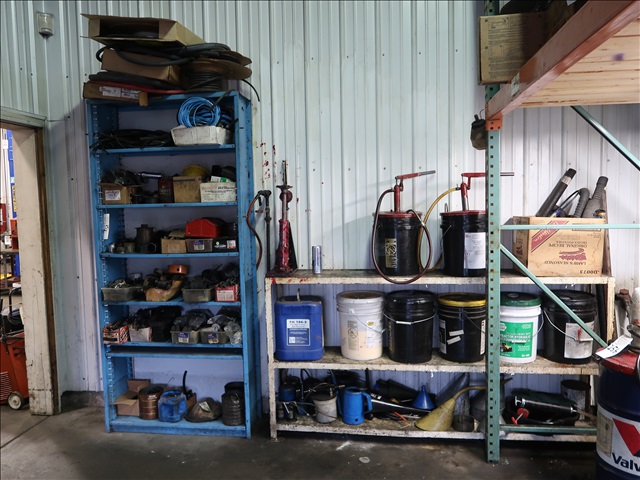 LOT, ASSORTED HARDWARE AND FLUIDS ON THIS SHELVING W/SHELVING