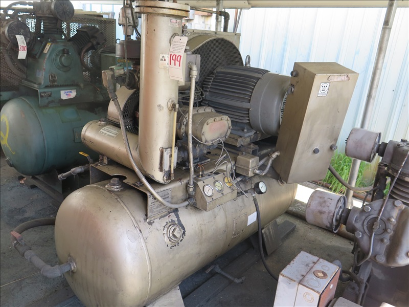 25 HP ROTARY SCREW AIR COMPRESSOR W/HORIZONTAL 120 GALLON TANK, 230/460V, 3-PHASE (POWER BREAKS AT SAFETY SWITCH, SAFETY SWITCH STAYS W/BUILDING, AIR LINES BREAKS AT 1ST VALVE)