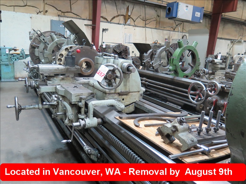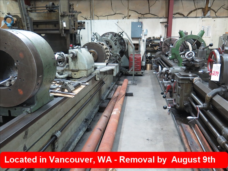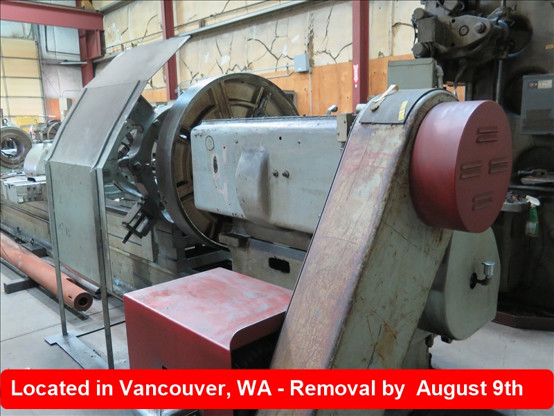 56" SLIDING GAP, 30" SWING OVER WAYS, 17' CLOSED, 12" IN THE GAP, 26'6" CENTERS, GAP BED LATHE, (2) 4-JAW, (1) 3-JAW CHUCK, (3) STEADY RESTS, TOOL POST HOLDER, TAIL STOCK