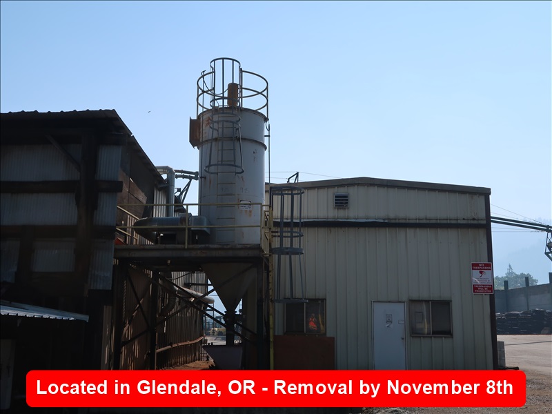 APPROX 6' DIA DUST COLLECTOR W/APPROX 24" 10 HP BLOWER W/PIPING FROM FILING ROOM, ROTARY AIR LOCK & DUMPSTER, STEEL FRAME