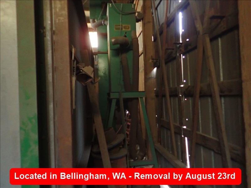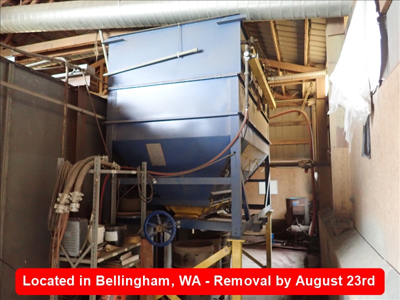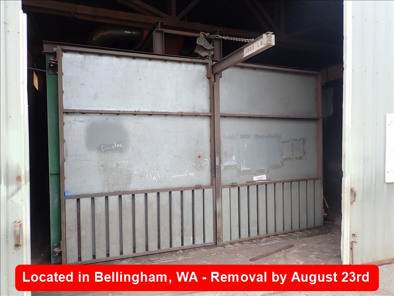 APPROX 16' X 30' X 10' DOUBLE DOOR DRIVE IN SAND BLAST BOOTH, CLEMCO 245 PNEUMATIC SAND BLAST POT W/HOSES, CLEMCO SHOT RECLAIM SYSTEM, VERTICAL SHOT TANK W/(4) TAKE AWAY BINS, DUST COLLECTOR & CONTROLS