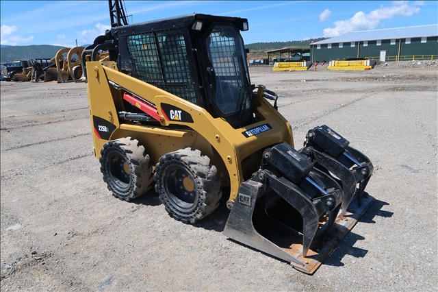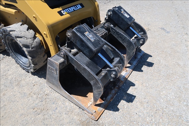 SKID STEER LOADER W/CAT C2-2T 52 HP ENGINE, CAT BUCKET W/DUAL CLAMPS, 5' BUCKET, 42" FORKS, CAB GUARDS & REAR WINCH TILT CAB