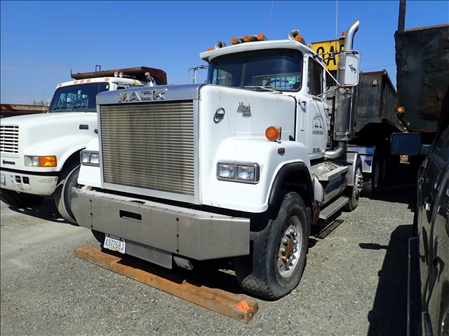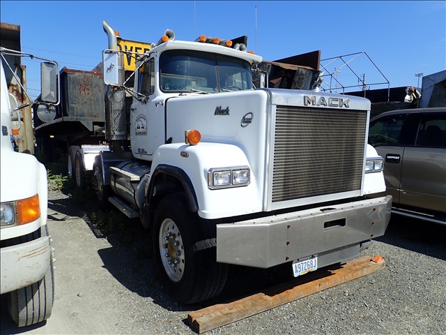1989 MACK RW713 TRI/A TRUCK TRACTOR, V8 DIESEL, MAXITORQUE 12 SPD, CAMEL BACK SUSP, DBL FRAME, WET KIT, 233" WHEEL BASE, DROP AXLE, CAB GUARD, SLIDING 5TH WHEEL, S/N: 1M2AY40C2KM004587