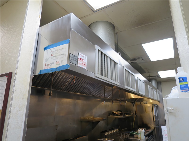 AMEREX DOUBLE COMPARTMENT LIGHTED HOOD W/AMEREX KP-375 DOUBLE BOTTLE WET CHEMICAL FIRE SUPPRESSION SYSTEM, (2) EXTERIOR FANS & SS BACKSPLASH
