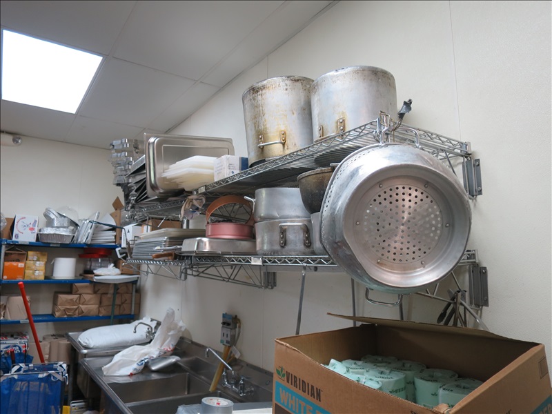 SS WALL MOUNT SHELVES TO INCLUDE: (5) 4', (1) 3', (4) 4' WIRE, (1) 3' 2-TIER & (2) 3' WIRE
