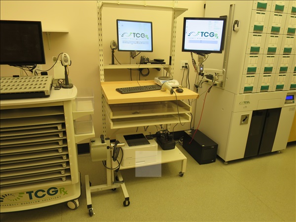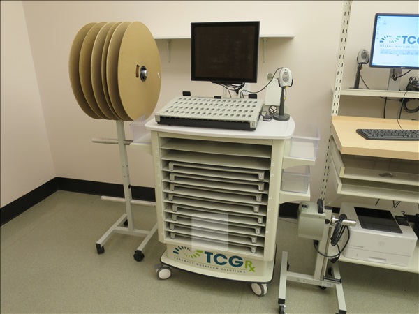 ATP-E320W 20-STATION ATP320-TRAY UNIT/DOSE POUCH PACKAGING SYSTEM W/TCGRX ATP320 MANUAL DOSE PACKAGING SYSTEM, INTERAGRATED CENTRAL PROCESSING WORK STATION, TCGRX PACKAGING REWINDER