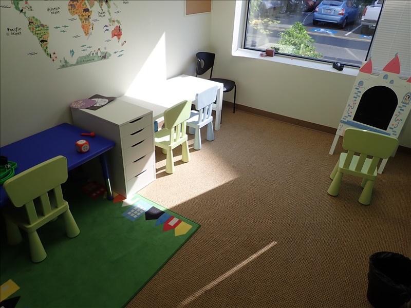 GYM AREA TO INCLUDE: FISHER PRICE SLIDE, (2) EXERCISE BALLS, (2) KIDS CHAIRS & ASSORTED THERAPY EQUIPMENT