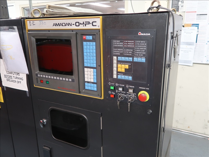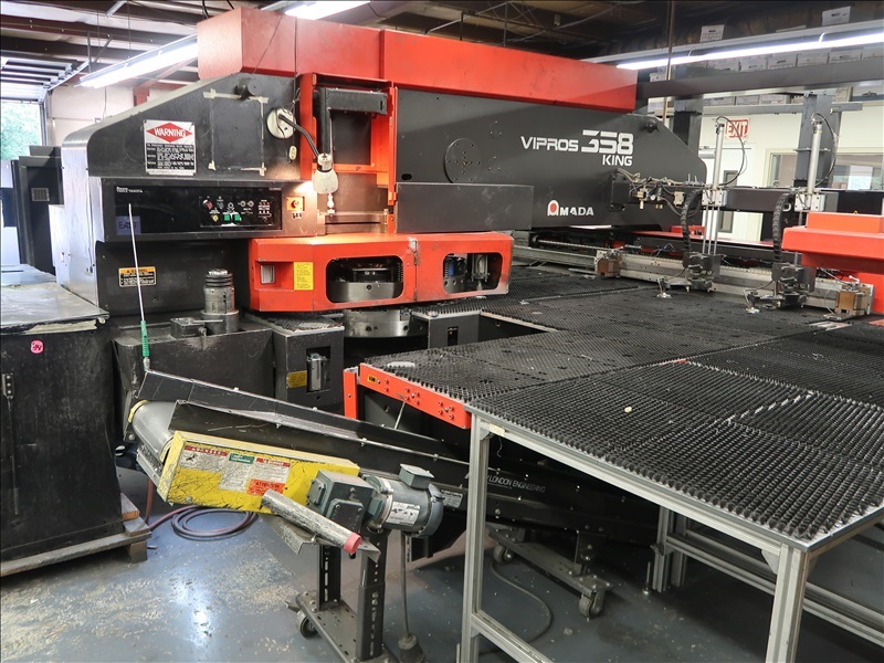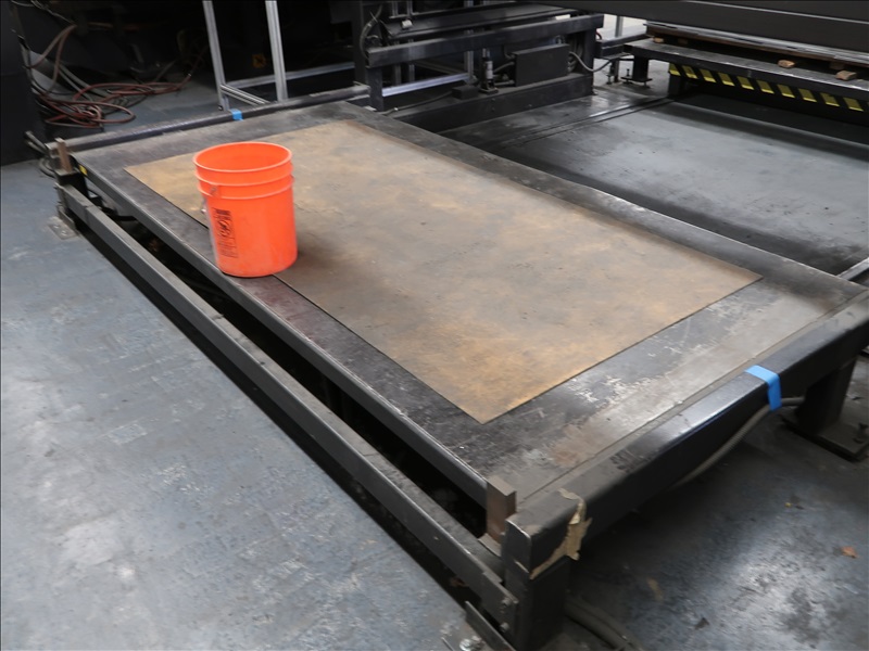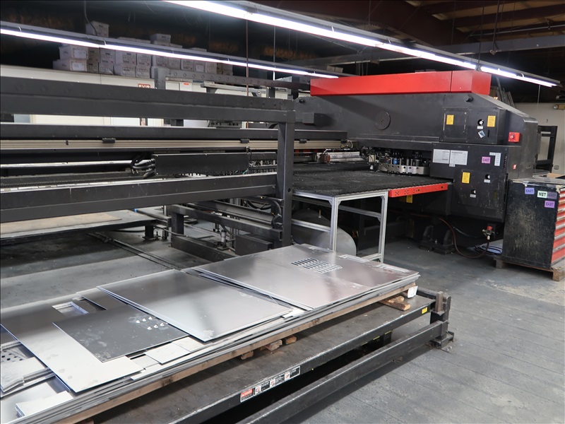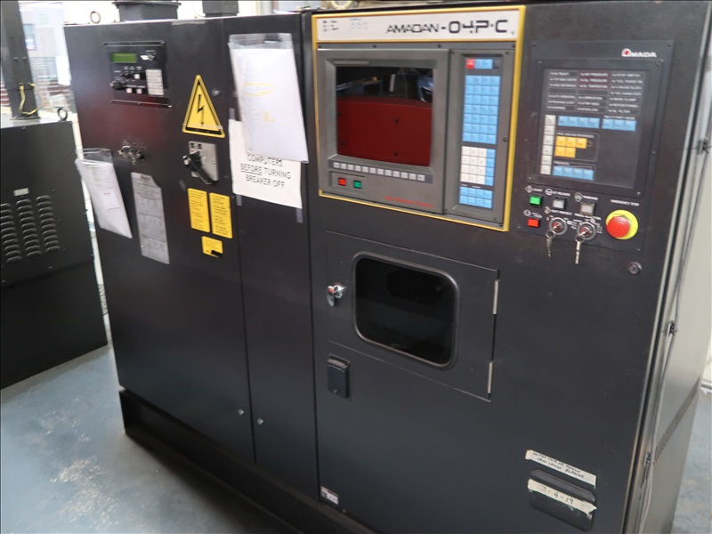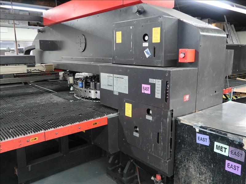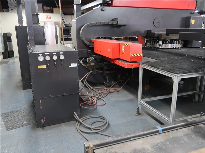 30-TON TURRET PUNCH, 58-PUNCH STATIONS, 25 KVA, AMADA 04PC POWER STATION CONTROLS, 200L HYDRAULIC PUMP STATION, SBC EX 5.5 CHILLER, 5' THROAT W/TABLE, 4'X10' SCISSOR LIFT INFEED TABLE W/VACUUM POSITIONER, (2) 4'X10' OUTFEED SCISSOR LIFT TABLES W/VACUUM POSITIONERS, 8' OUTFEED CHIP CONVEYORS, 3-PHASE