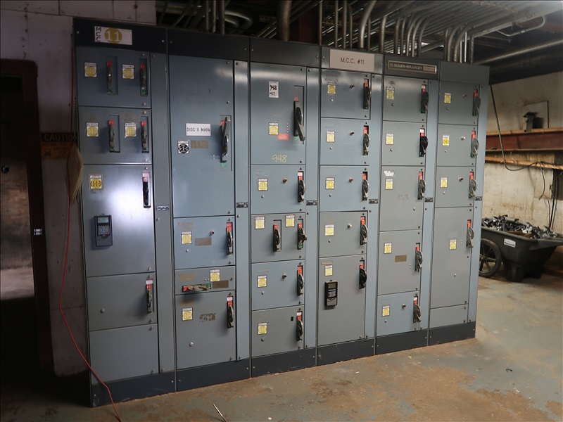 6-SECTION MCC W/(30) SWITCHES, (2) POWER FACTOR DRIVES TO 7-1/2 HP (SAWMILL BASEMENT)