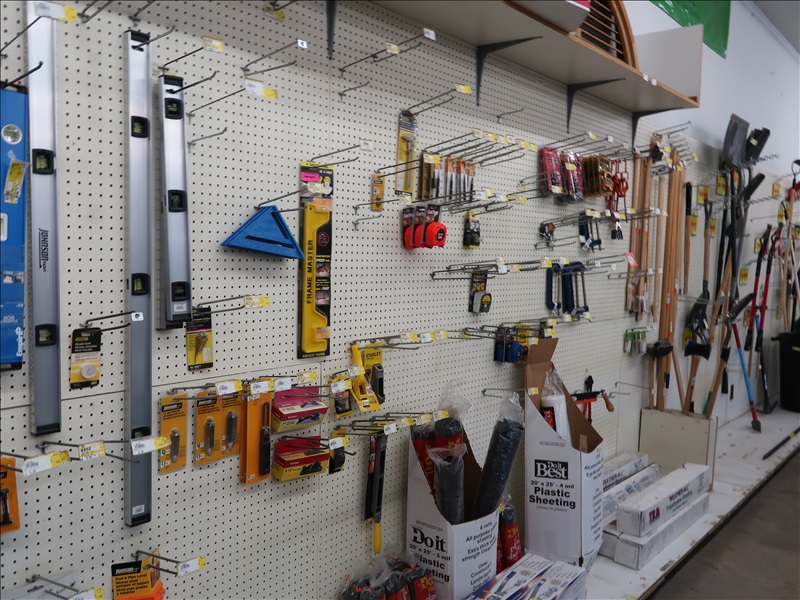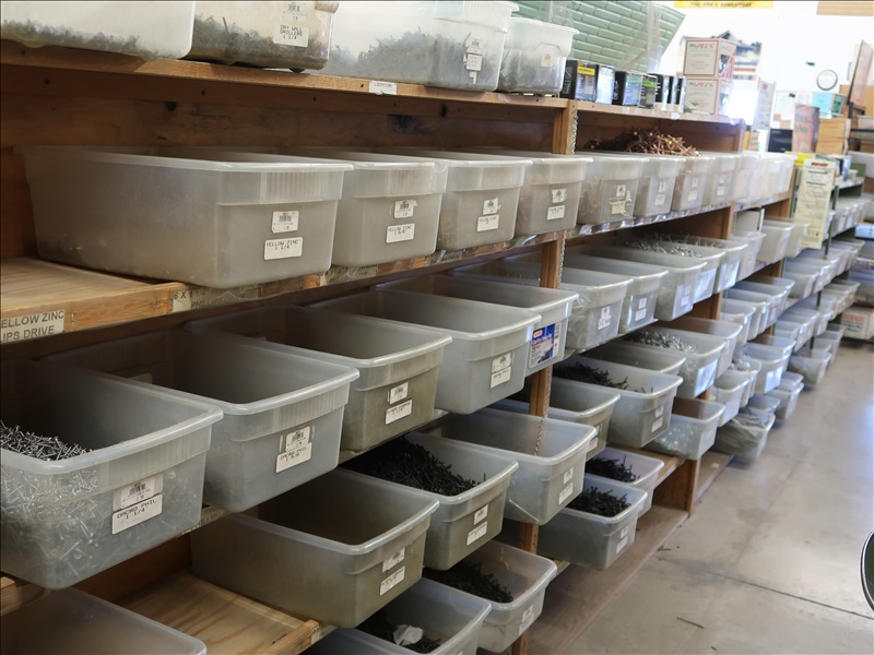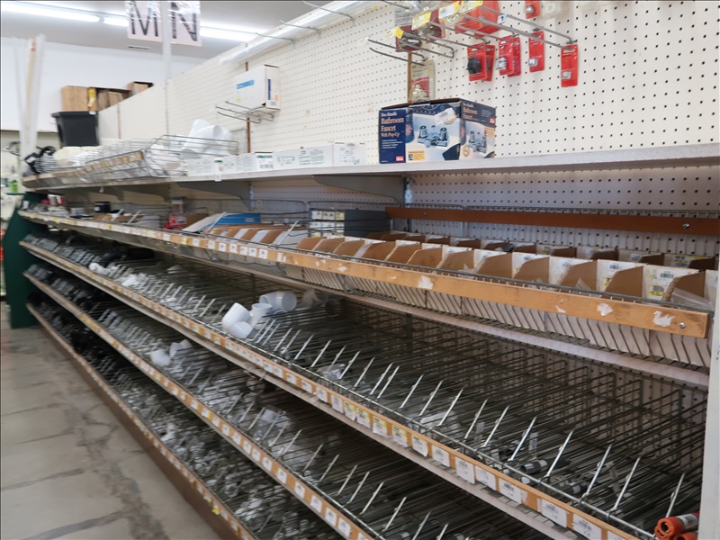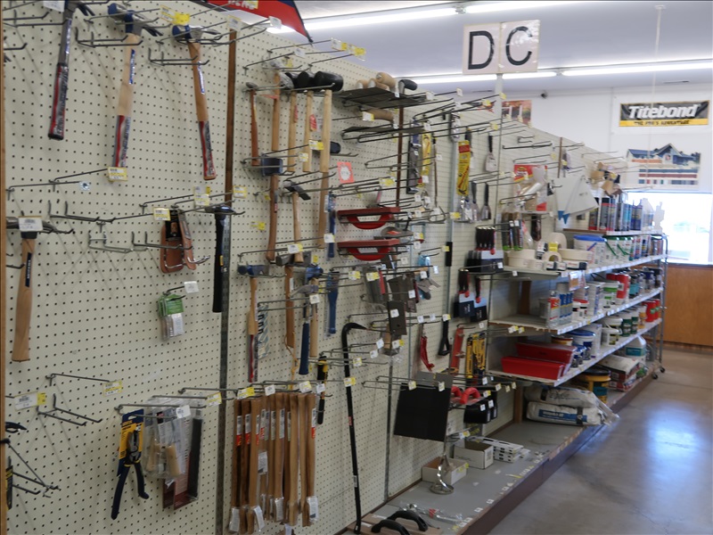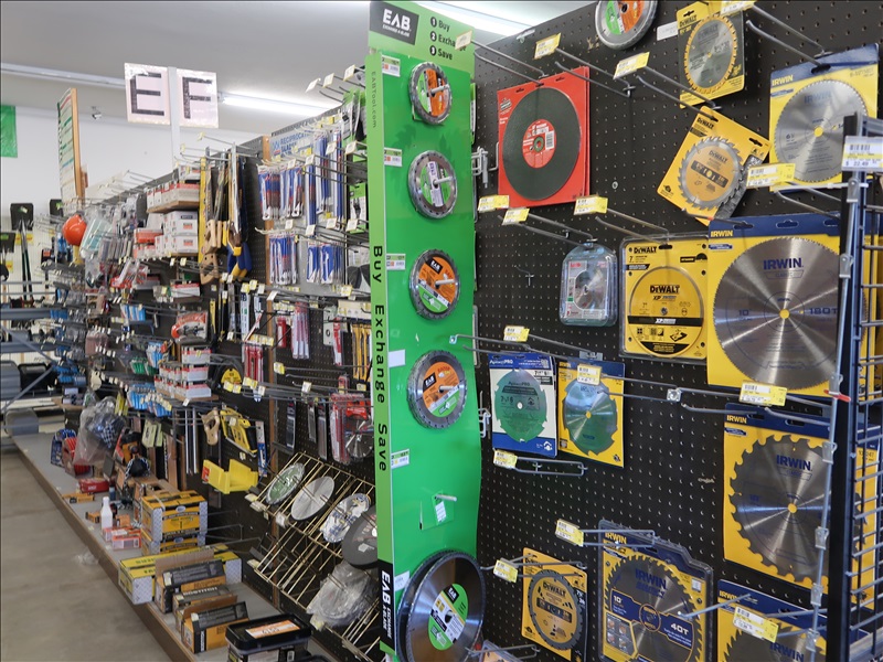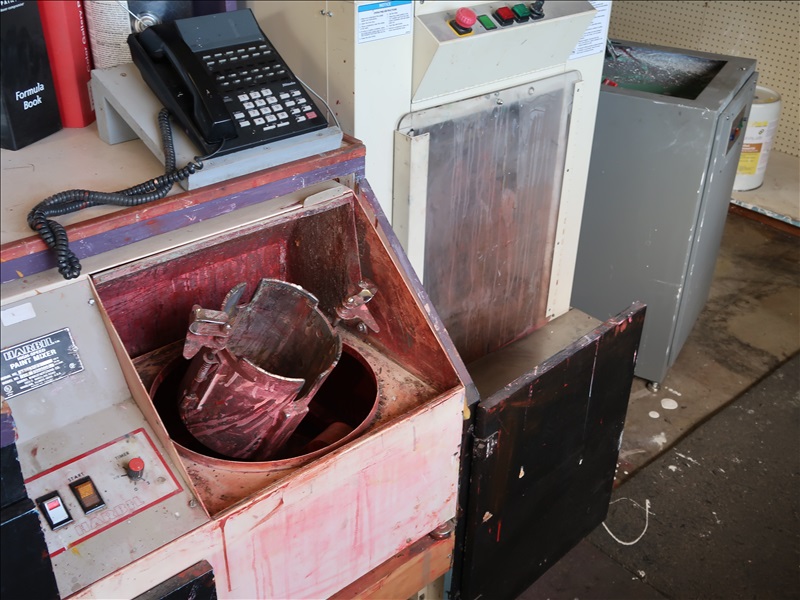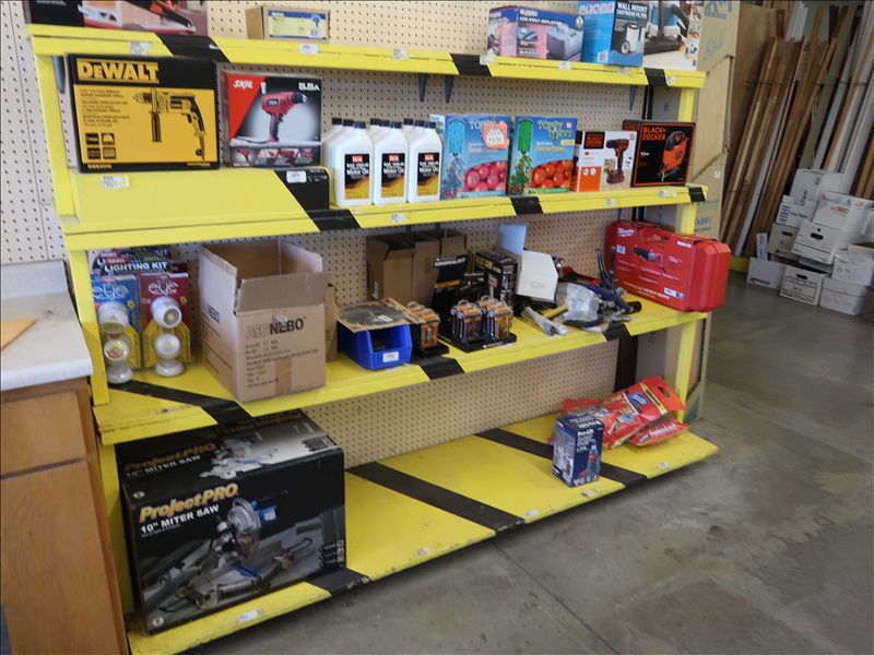 NORTHFIELD 36" VERTICAL TILT TABLE BANDSAW W/5 HP/900 RPM MOTOR, S/N:741-809F; MILWAUKEE 4'X8' PANEL SAW W/8" SAW; IRVINGTON 16" RADIAL ARM SAW; 16"X12' BELT CONVEYOR W/GEARHEAD MOTOR; (3) 10" CHOP SAWS; 1 HP DUST COLLECTOR; MAKITA LS1 12" COMPOUND MITER SAW; DELTA SHOPMASTER 10" MITER SAW; PROJECT PRO 10" MITER SAW; MILWAUKEE 12 AMP SAWZALL; DEWALT DWE5010 1/2" HAMMER DRILL (UNUSED IN BOX); (2) WERNER 8' FIBERGLASS STEP LADDERS; HONEYWELL I-CLASS MARK II LABEL PRINTER; PERFORMANCE 040 SERIES KEY MACHINE; HARBIL 12-STATION PAINT COLORANT DISPENSER; HARBIL G8 HIGH SPEED PAINT MIXER; HARBIL 5G-HD MIXER; COLOR RESOURCES MIXER; (1) 6-TRAY & (2) 5-TRAY ROTARY PARTS BINS; BOLT BINS; NUMEROUS SMALL WOOD BUILDINGS