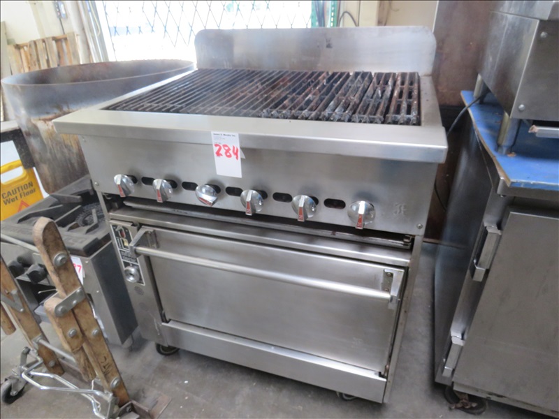 OVEN W/6-BURNER CHAR BROILER ON CASTERS (MUST BE PICKED UP BY 12 PM, TUESDAY, JULY 30TH)