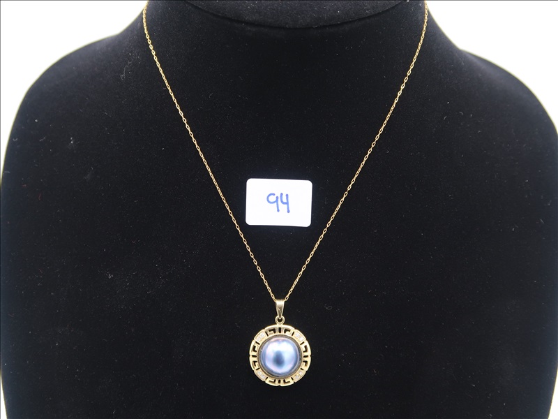 14K YELLOW GOLD BLACK MABE PEARL PENDANT WITH GREEK KEY DESIGN BORDER, & 8 ROUND DIAMONDS (DIAMONDS TEST POSITIVE), RETAIL PRICE: $850, GRAMS:5.1 DIA WT: 0.16