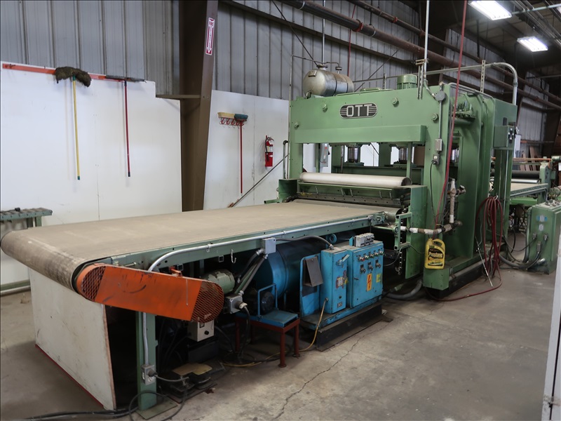 HOT PRESS, 55"X102" CAPACITY, (4) RAMS W/150MM STROKE, 11KW BOILER, APPROX 55" X 110" POWERED INFEED BELT, APPROX 48" X 117" POWERED OUTFEED BELT, CONTROLS & ELECTRICS, IN & OUTFEED SCISSOR LIFTS AVAILABLE