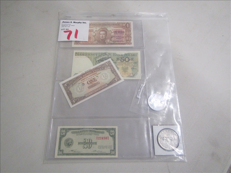 LOT, ASSORTED FOREIGN COINS & CURRENCY (.5 OZ .9999 SILVER)