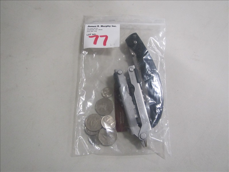LOT, ASSORTED KNIVES & FOREIGN COINS