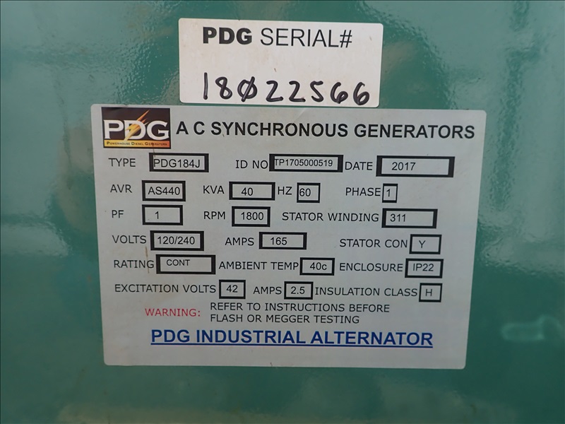 40 KVA, 165 AMP, 120/240V,SINGLE PHASE GENERATOR,PERKINS 1104D-44T, 4 CYLDIESEL S/N: NL70981, U304999C(UNUSED) ON FACTORY SKID