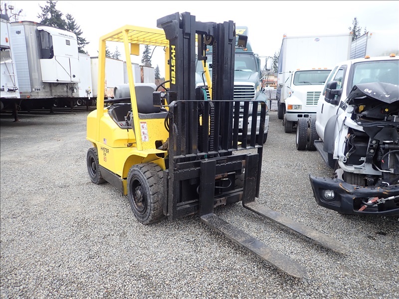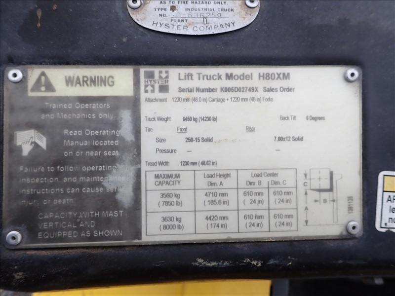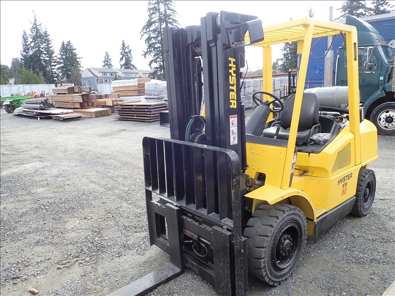 8,000 LB SOLID TRACTION TIREFORKLIFT, 185" FORK HEIGHT,3-STAGE MAST, SIDE SHIFT,LUMBER FORKS, 6 CYL LPG(BAD STARTER OR RING GEAR)HOUR METER READS: 5,593