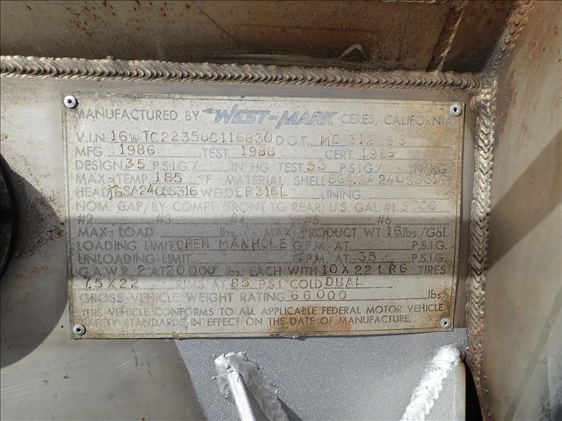 5,000 GALLON S/S T/A TANK TRAILER, EXTERIOR 8 GA, 316 S/S, DOUBLE DIAPHRAGM PUMP, AIR COMPRESSOR