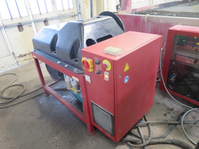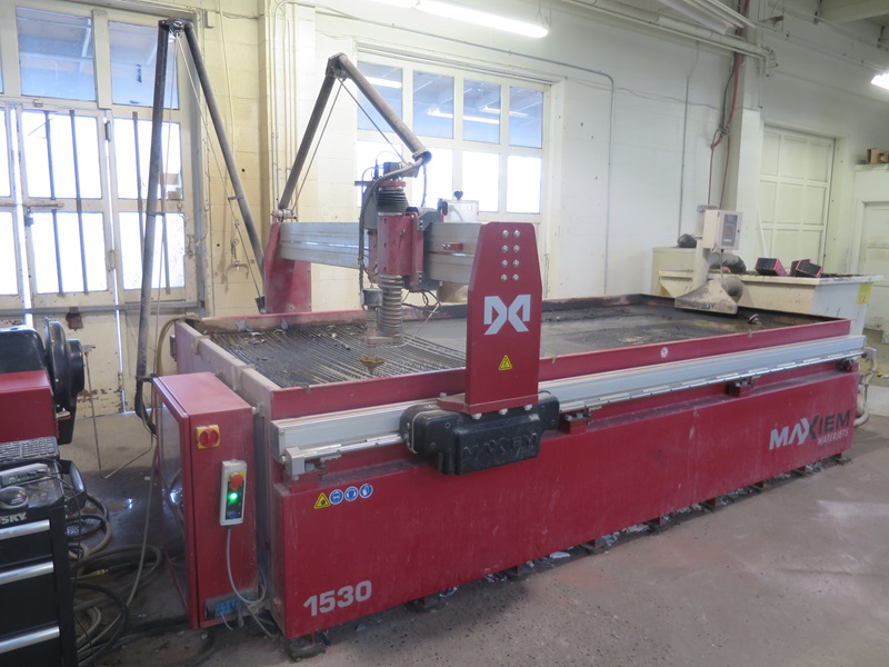 ABRASIVE WATER JET CUTTER MACHINE W/X-Y-Z AXIS MOTION SYSTEM, 5'2" X 10' X-Y CUTTING ENVELOPE, OMAX ARTICULATED GLASS CUTTING NOZZLE, TRACK IS UNDAMAGED, DIRECT DRIVE PUMP, COMPUTER CONTROLLED, PENDANT EMERGENCY STOP/START, CLEMCO 2542 6-CUBIC YARD ABRASION TANK, OMAX 1.5 HP SOLID WASTE REMOVAL SYSTEM SLUDGE PUMP W/TILTING WASTE BIN: 480V, 3-PH