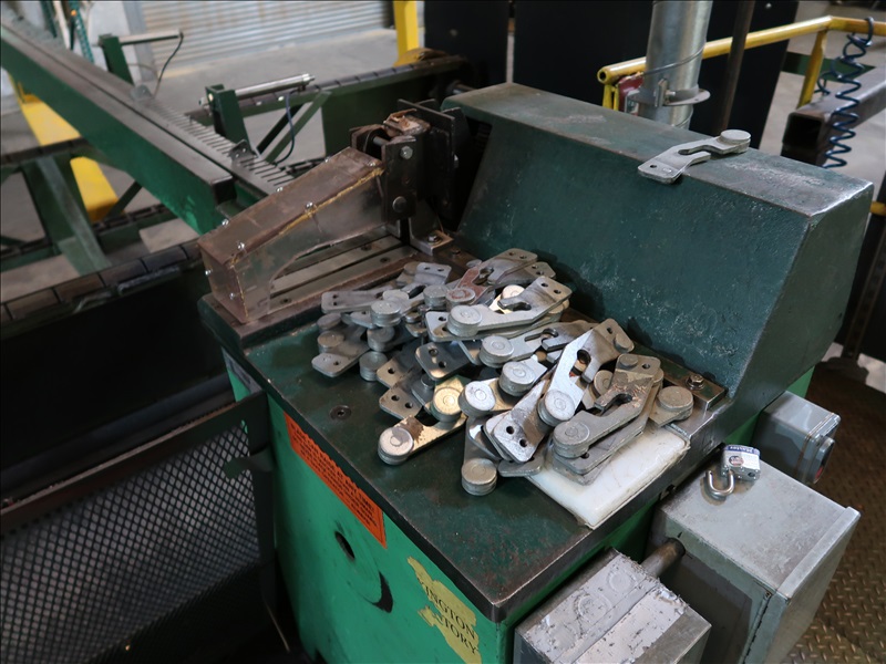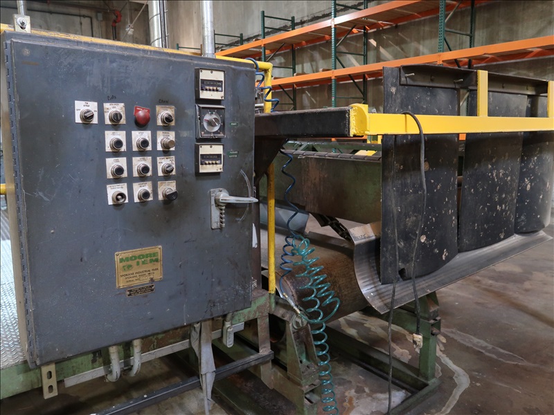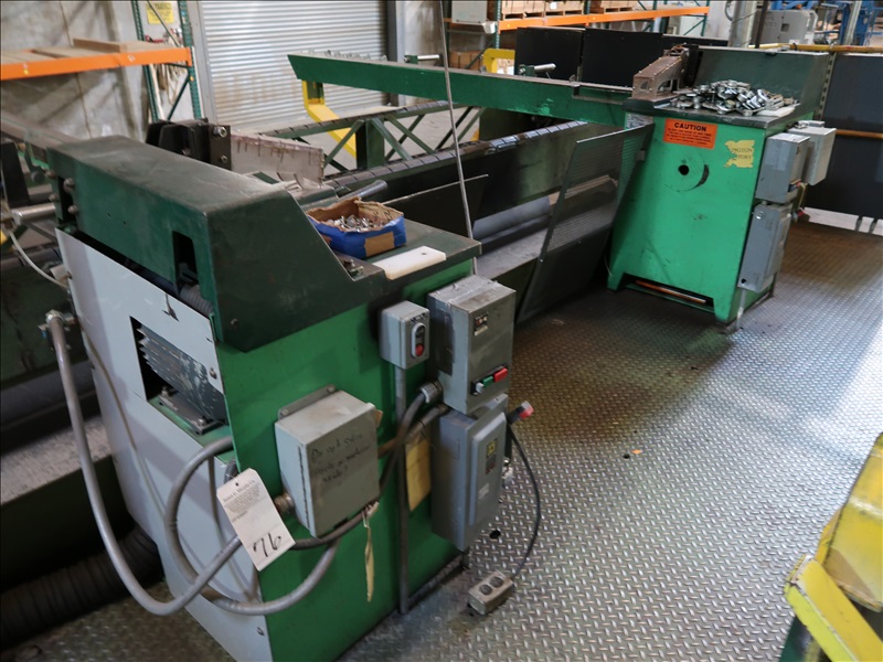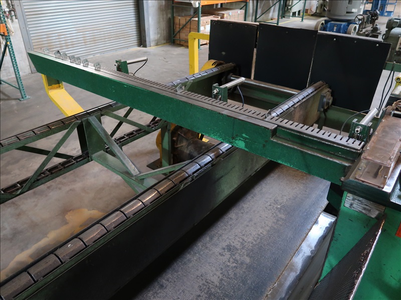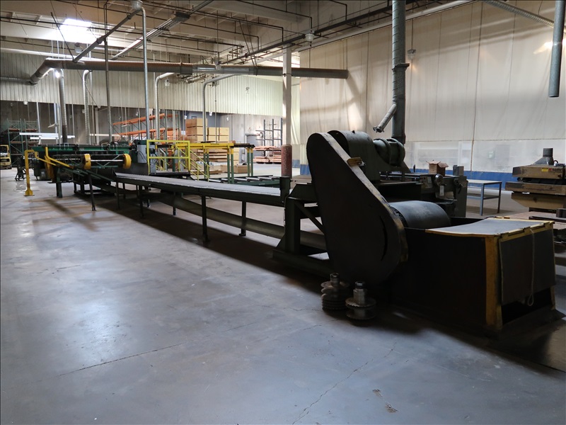CHOP SAW LINE W/(2) PRECISION 14MLH CHOP SAWS W/7-1/2 HP/3,500 RPM MOTORS, INFEED GRAVITY ROLLCASES, OUTFEED LUMBER GAUGES W/PNEUMATIC KICKERS, GLOBE 3'X18' DOUBLE SCISSOR LIFT W/POWERED 44" ROLLS, 19' 2-STRAND H138 OUTFEED TRANSFER & 28"X52' TRANSFER BELT W/DRIVES