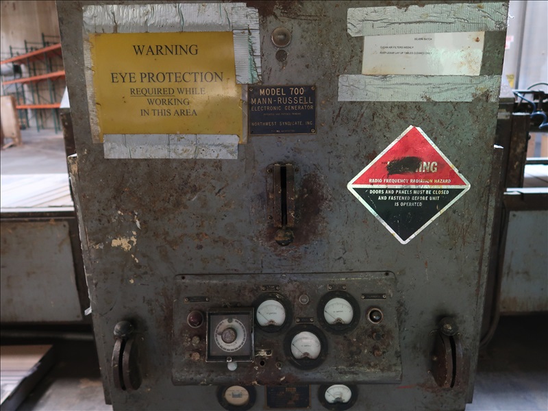 RF BATCH LUMBER EDGE GLUER, 46KW GENERATOR, 8,500V BED PLATE, 42"X84" CAPACITIES, 42" CANTED SLAT BED TRANSFER