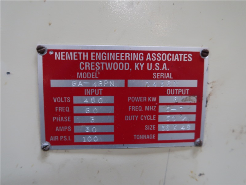 6KW SLANT FACE GLUER, APPROX 36"X48" CAPACITY, 5-7 FREQUENCY MEGAHERTZ