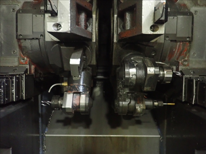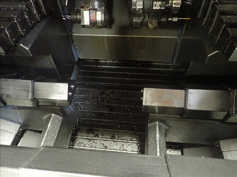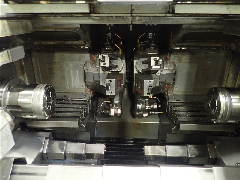 DUAL TURRET CNC LATHE, (2) 12-STATION TURRETS, (7) VERTICAL LIVE TOOL HOLDERS, (3) HORIZONTAL LIVE TOOL HOLDERS, MAYFRAN CT20 CHIP CONVEYOR, MAZATROL T PLUS CONTROLS, BAR FEEDER READY, ROYAL FX1200 FILTERMIST, S/N: 134980