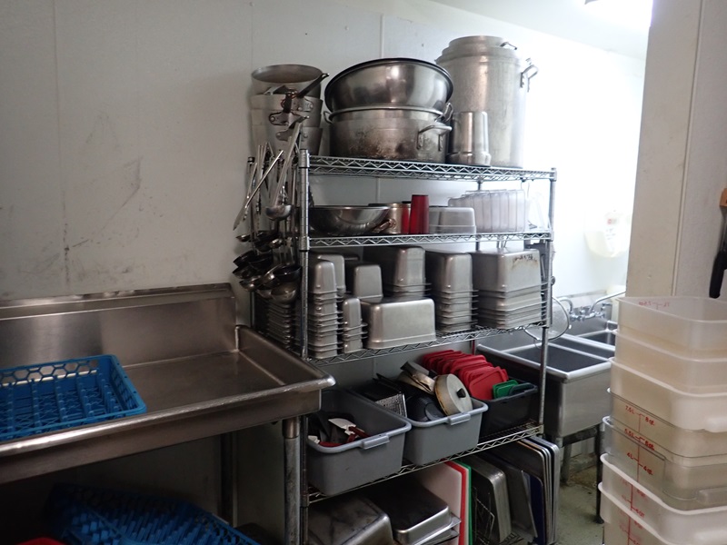Wire rack w/ss inserts, sheet pans, stock pots, ss bowls, utensils & misc. kitchen supplies