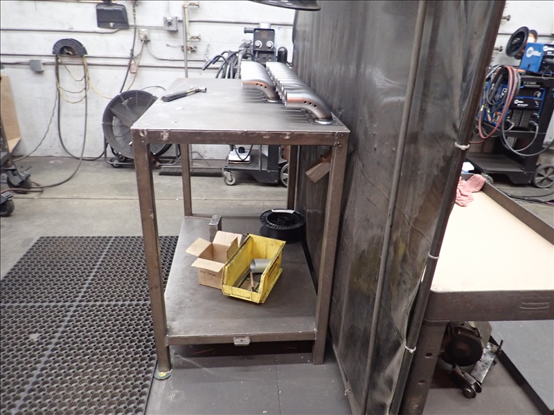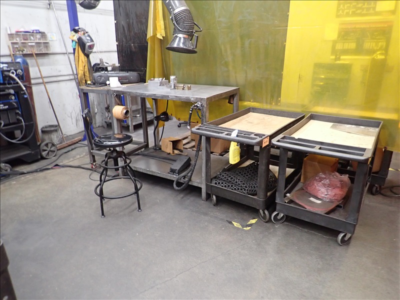 GROUP OF STEEL WELDING TABLES, FIXTURE SHELVING UNITS, DOLLY, PALLET JACK, DRUM CARTS & MISC SUPPLIES