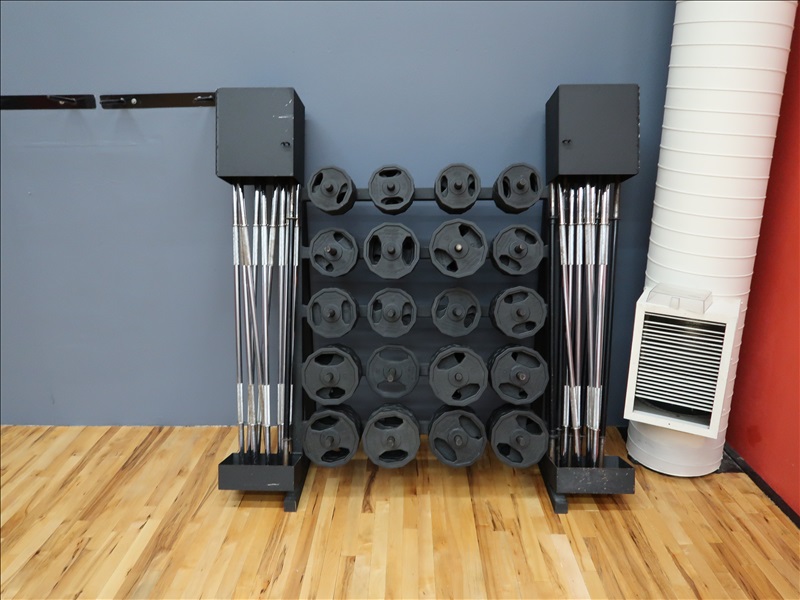 (28) BARBELLS W/ ASSORTED 2.5-10 LB PLATED WEIGHTS & STATION