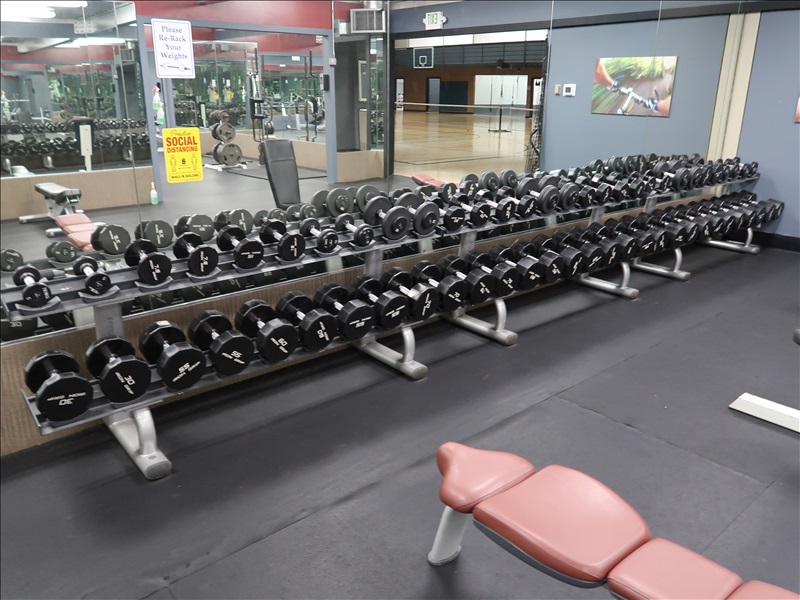 ASSORTED 5-120 LB DUMBBELLS W/ (3) WEIGHT RACKS