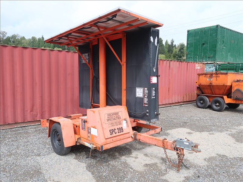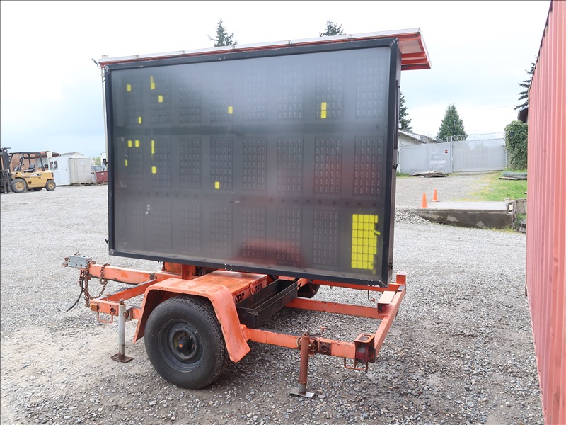 S/A TRAILER MOUNTED MESSAGE BOARD, SOLAR, SURGE BRAKES (NEEDS REPAIR, MISSING SOME BATTERIES, NON-WORKING)