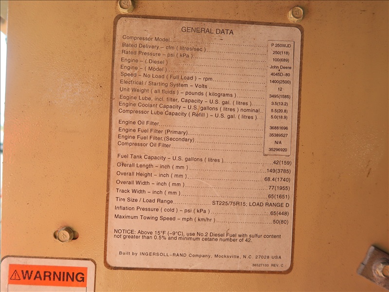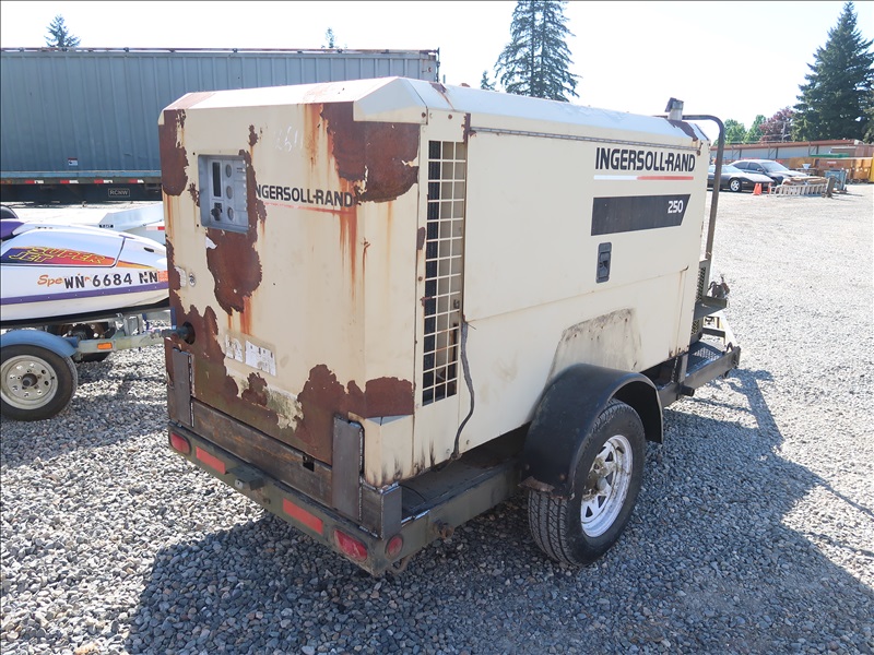 S/A, 1997 INTERSOLL RAND, CFM TRAILER MOUNTED AIR COMPRESSOR, JOHN DEERE, 4045D-80 4 CYL DIESEL, E/B, 205/75R15