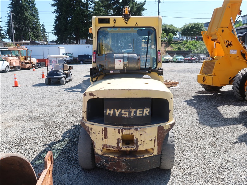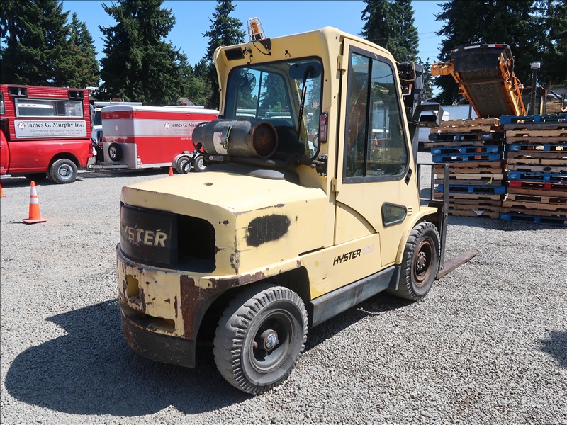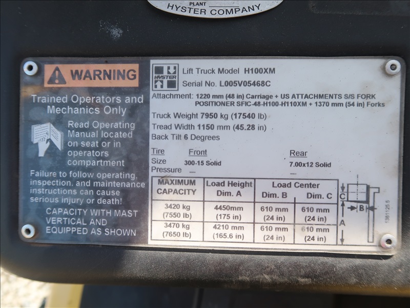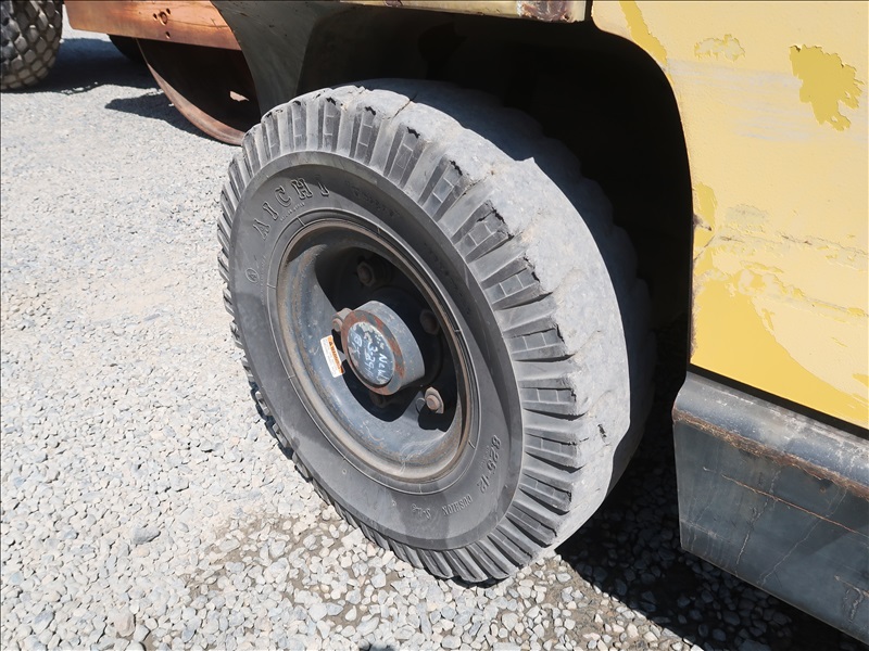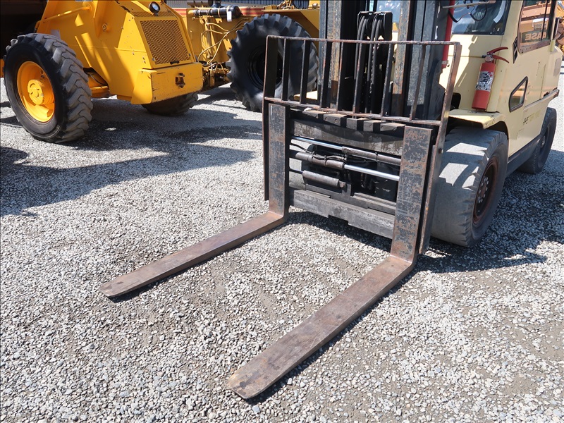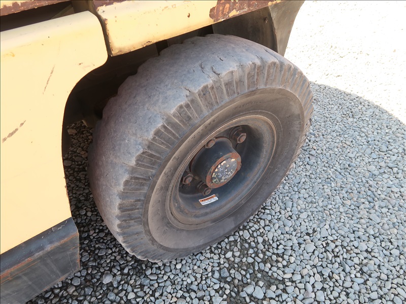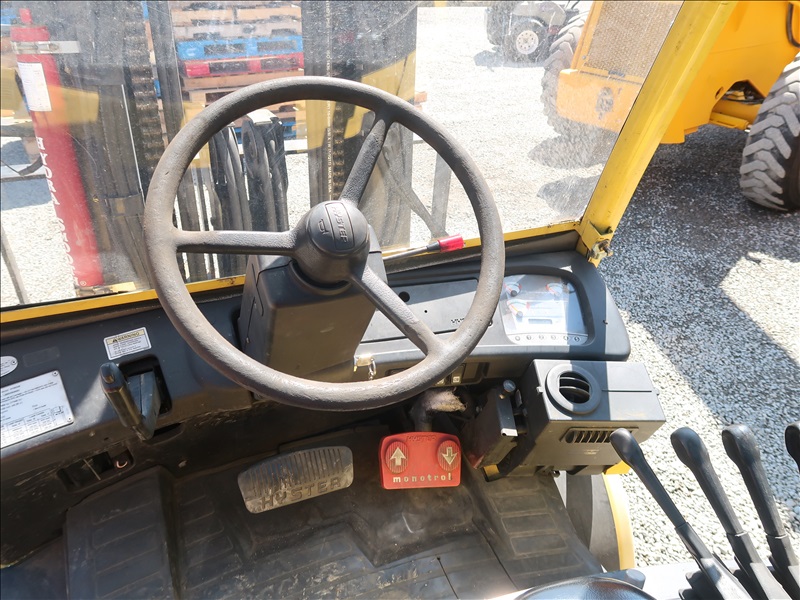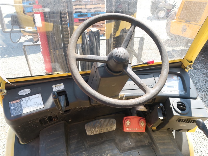 7,650 LB SOLID CUSHION TIRE FORKLIFT, 174" FORK HEIGHT, 3-STAGE MAST, SIDE SHIFT, FORK POSITIONERS, HYDRO SMOOTH ACCUMULATOR, 6 CYL LPG, CAB