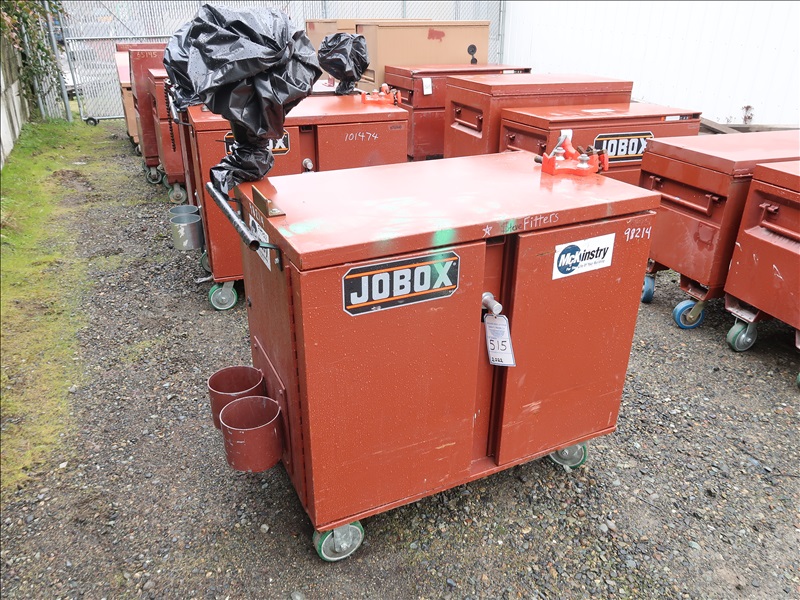 44"L X 27"W JOBSITE STORAGE CABINET ON CASTERS W/RIDGID BC-410 PIPE VISE, 1/8" - 4" CAP