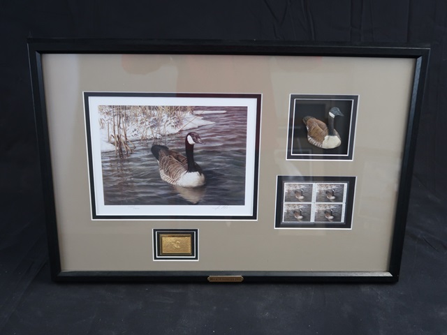 "DUCK'S UNLIMITED" 2011 FRAMED PRINT W/STAMPS SIGNED BY DENNIS MINOR 1005/3000 23-1/2" X 15-3/4" (NO CERTIFICATE OF AUTHENTICITY)