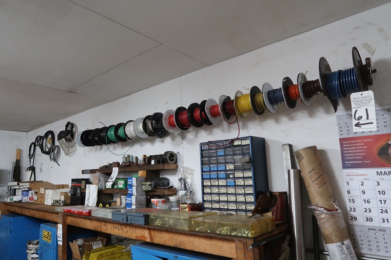 LOT, ASSORTED WIRE, FITTINGS & ASSORTED ELECTRICAL ON TOP SHELF W/ASSORTED ITEMS IN CORNER (NO WOOD SHELF)