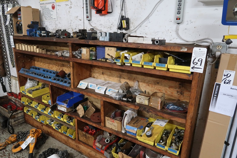 LOT, VALVES, BRASS STOCK, HYDRAULICS & ASSORTED FITTINGS W/WOOD SHELF