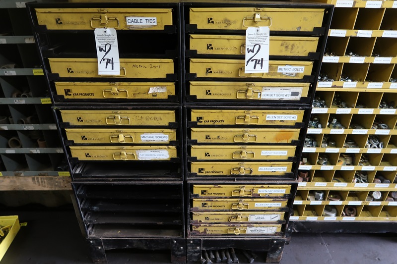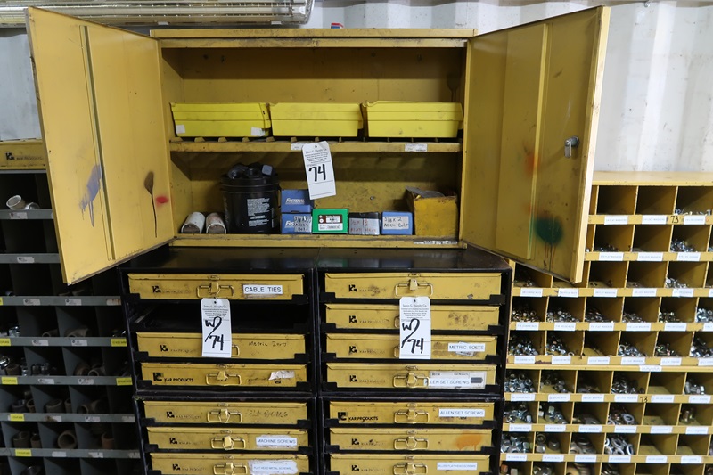 LOT, (18) KAR PRODUCTS PULL OUT BINS W/ASSORTED CONTENTS & 2-DOOR METAL CABINET W/CONTENTS