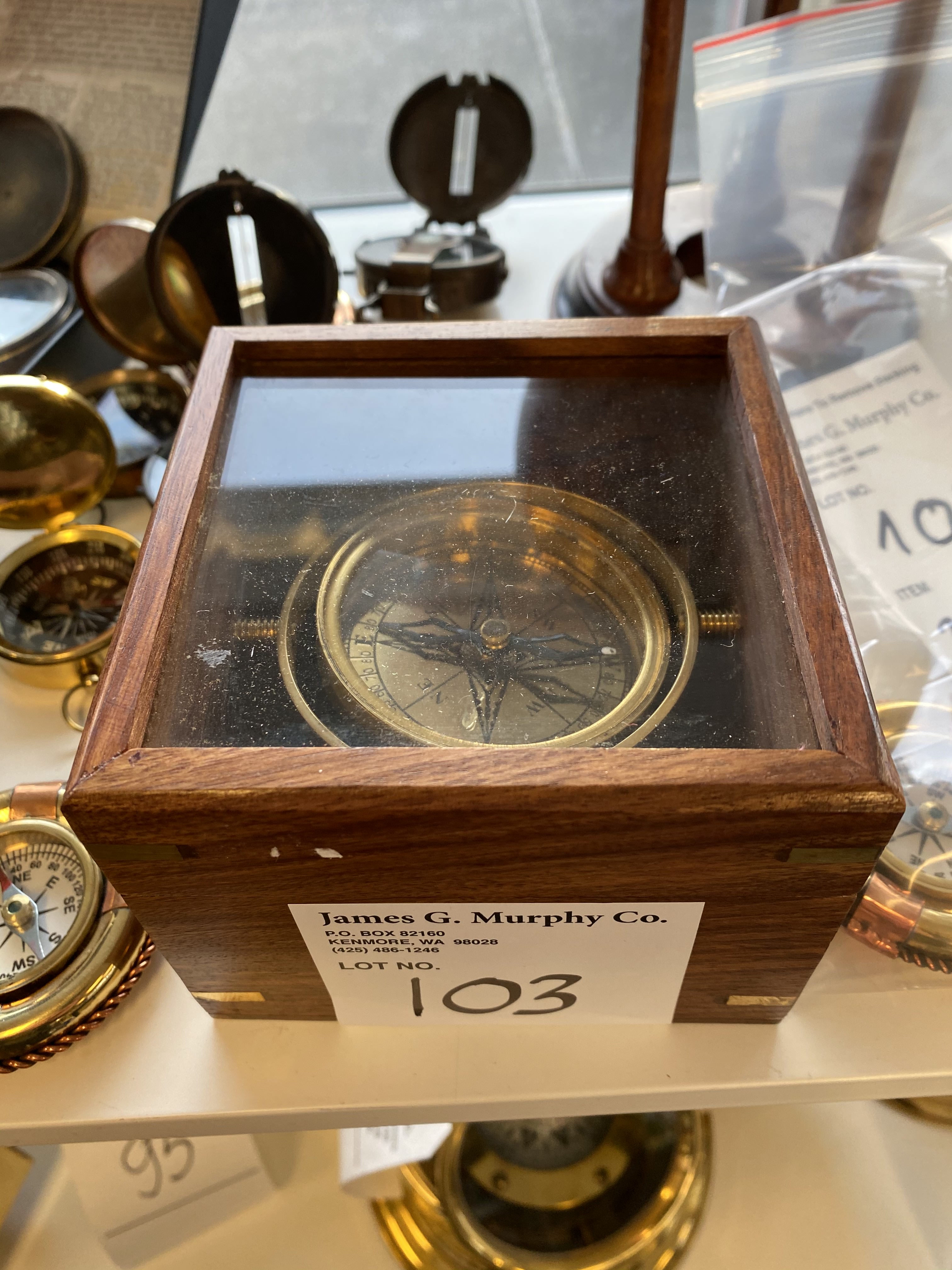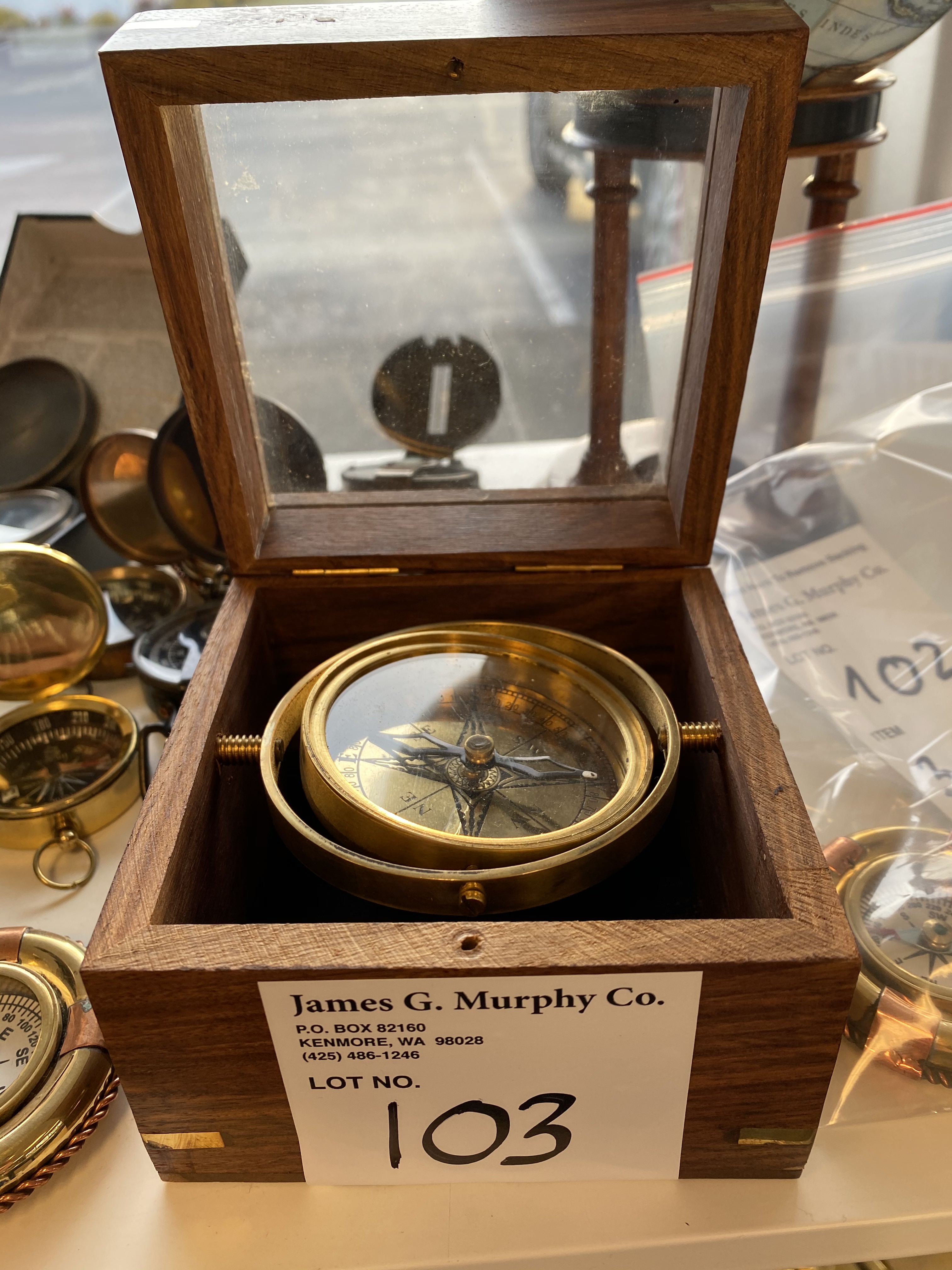 Brass compass in wooden box approx. 4.5" x 4.5" x 3.5"