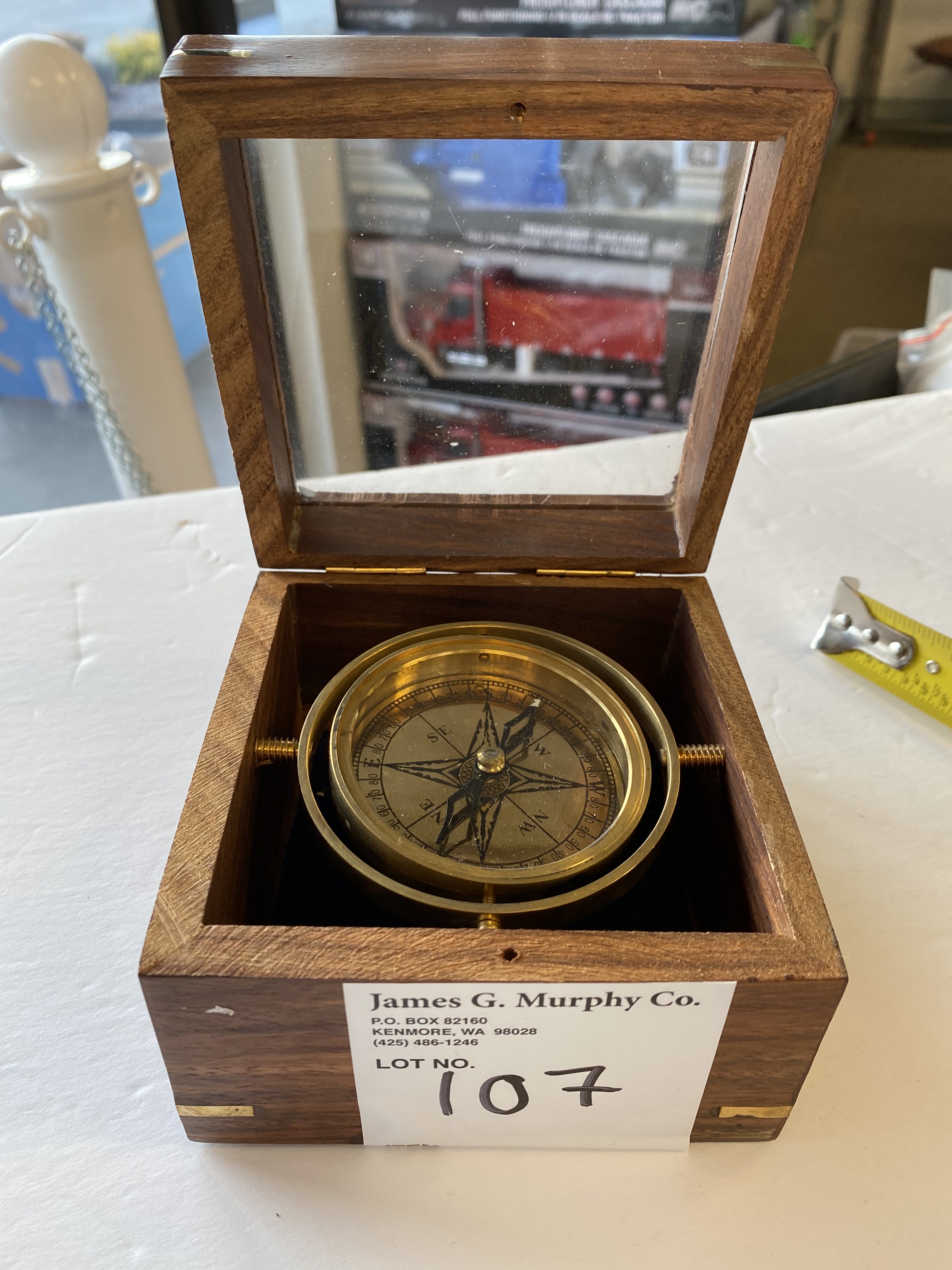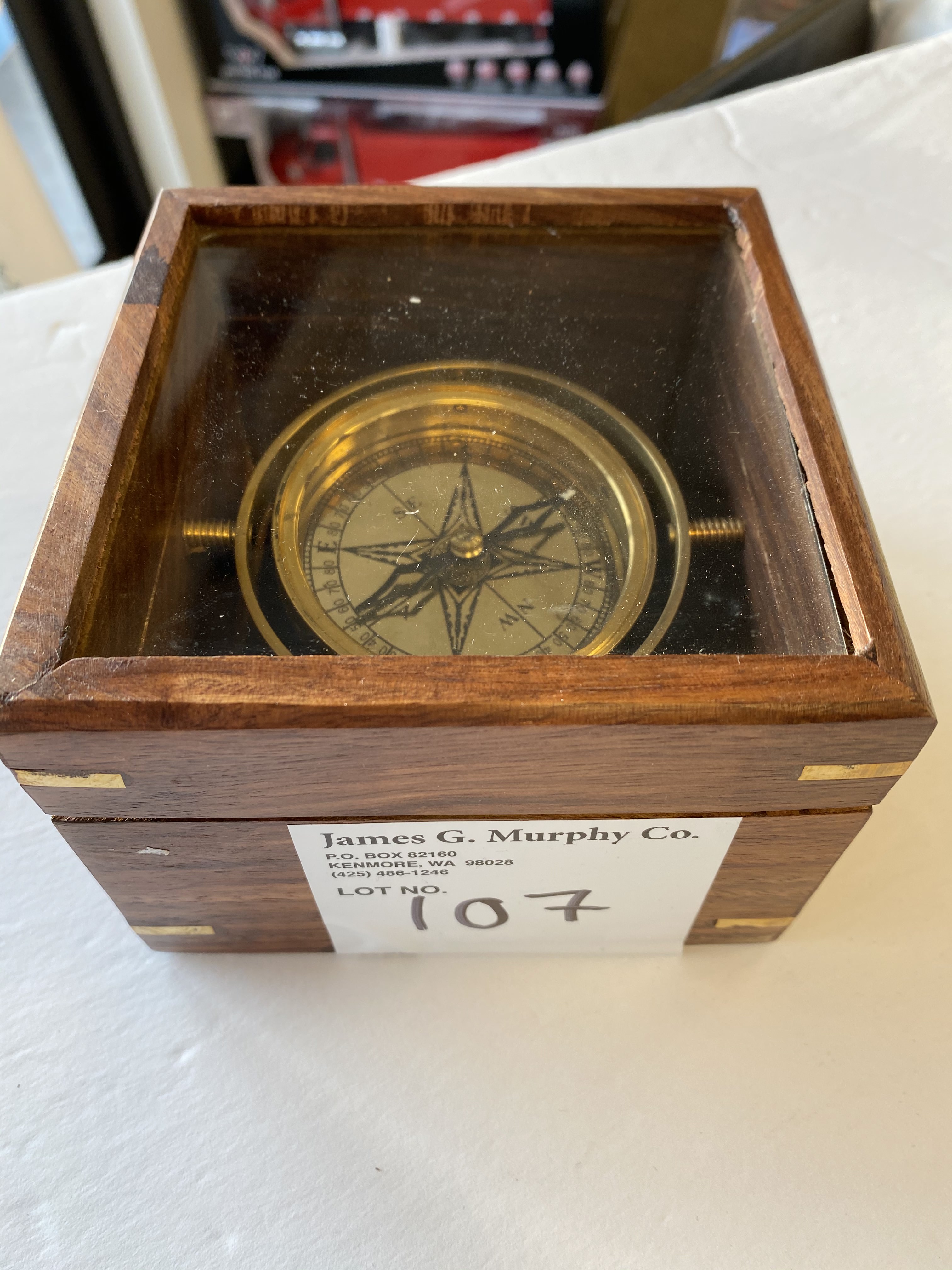 Brass compass in wooden box approx. 4.5" x 4.5" x 3.5"