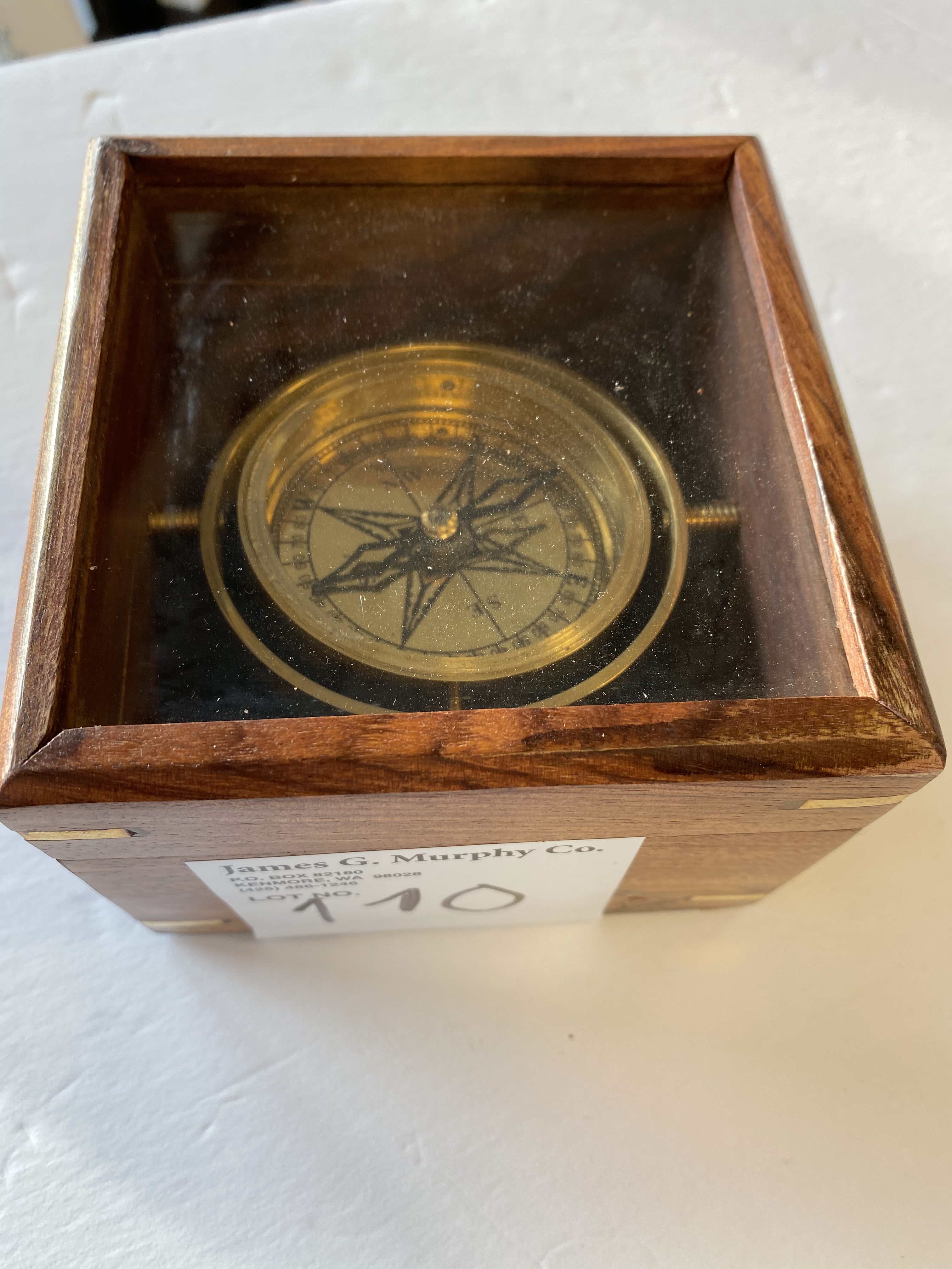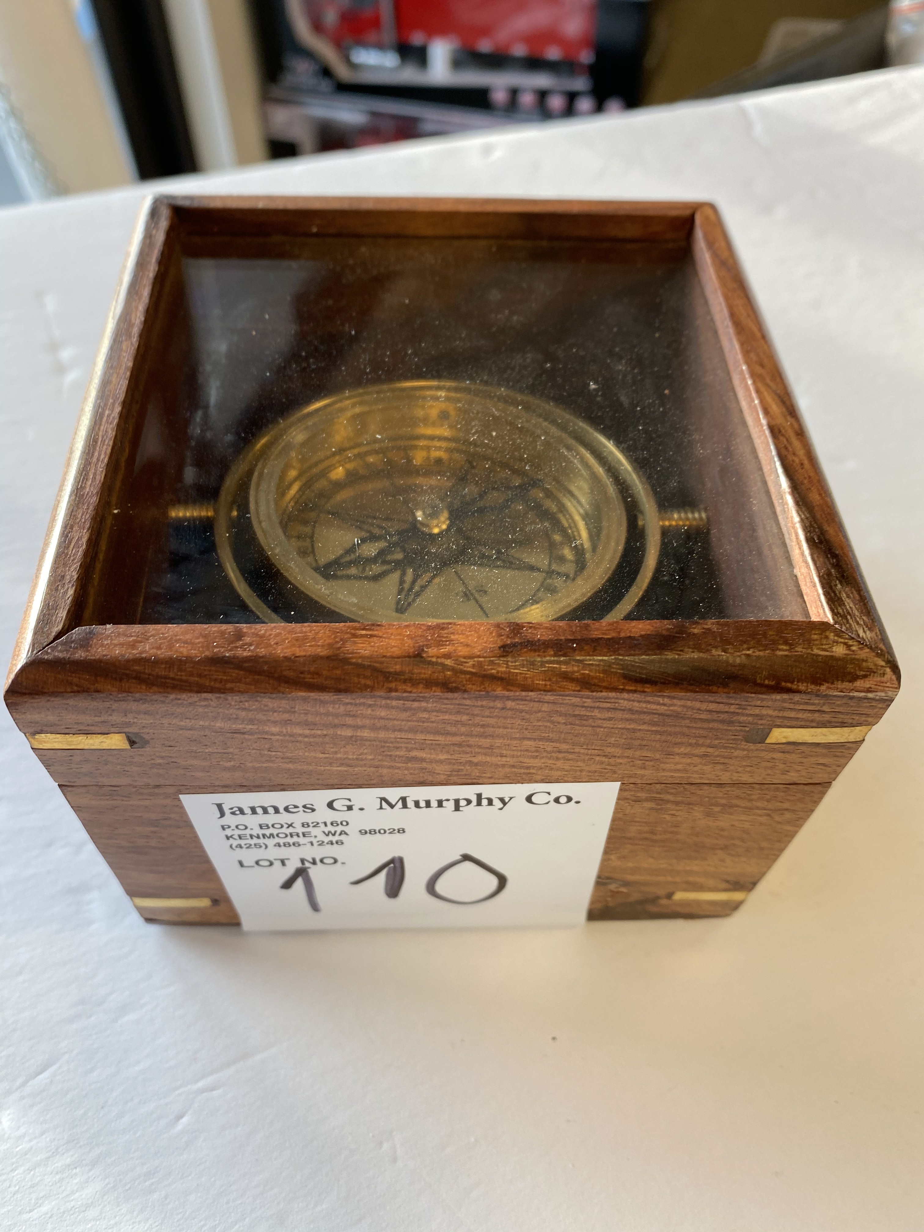 Brass compass in wooden box approx. 4.5" x 4.5" x 3.5"