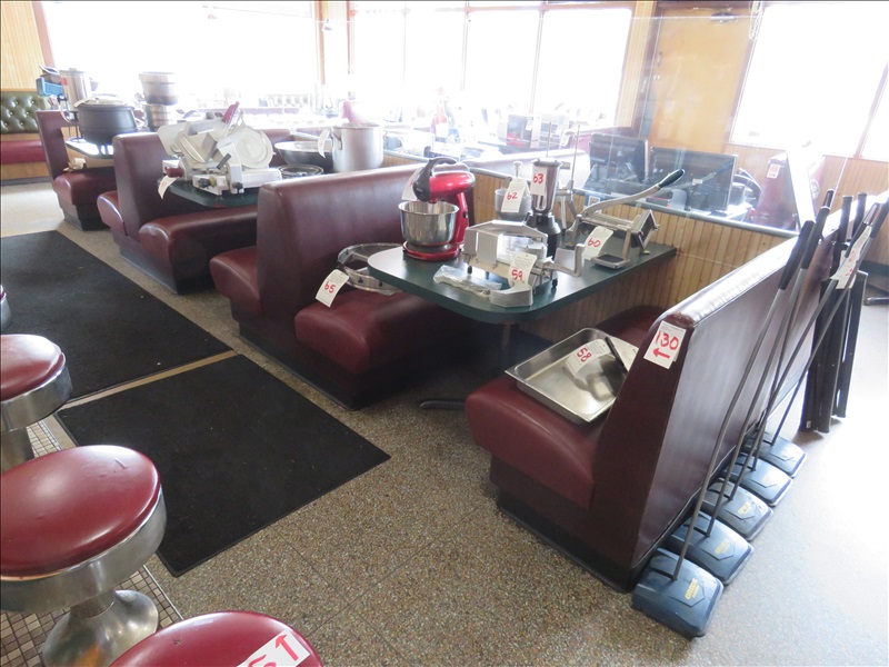 LOT, DINING SECTION TO INCLUDE: (6) 48" X 30" SINGLE PEDESTAL DINING TABLES, (4) 48" DOUBLE SIDED BOOTH SEATS, (4) SINGLE SIDED BOOTH SEATS & DIVIDING WALL (CAN NOT BE REMOVED UNTIL 12 PM, THURSDAY, AUGUST 26TH)