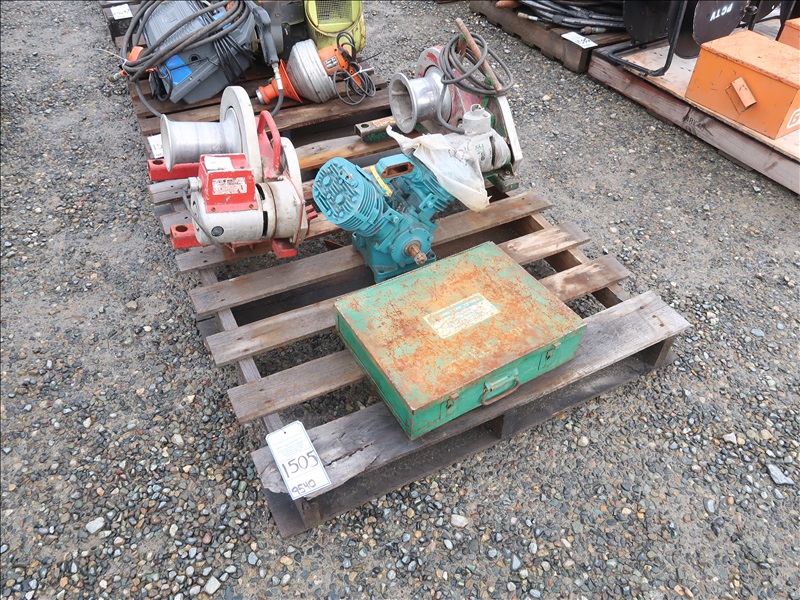 LOT, (2) ELECTRIC CABLE PULLERS, (1) ENGINE LUBRICATED COMPRESSOR & (1) 1/2" THRU 4" CONDUIT KNOCKOUT PUNCH SET (CONDITION UNKNOWN)