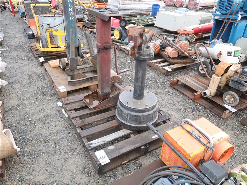 LOT, (1) 5" BENCHTOP VISE ON SHOP BUILT STAND & (1) ADJUSTABLE HAND CRANK TOOL STAND ON CASTERS ON THIS PALLET